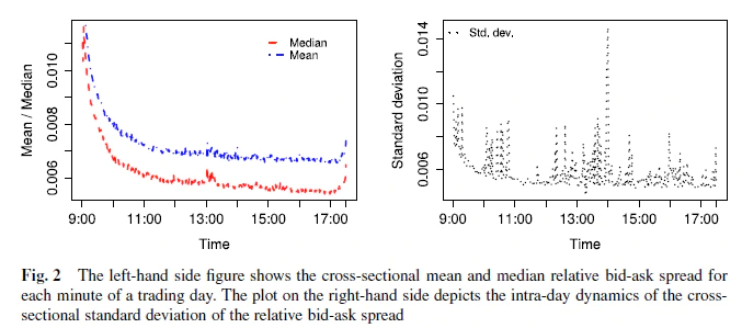 This paper explores the statistical and economical significance of intraday and -week patterns in bid-ask spreads. We investigate a large panel of high frequency data for stocks traded on the XETRA trading platform and observe significant patterns in spreads. In addition to showing the robustness of our findings over time, as well as in cross-section, we are also able to demonstrate the patterns’ predictability in an out-of-sample approach. Our findings have clear implications, especially for uninformed but discretionary liquidity traders, which allow significant and economically relevant reductions of transaction costs.