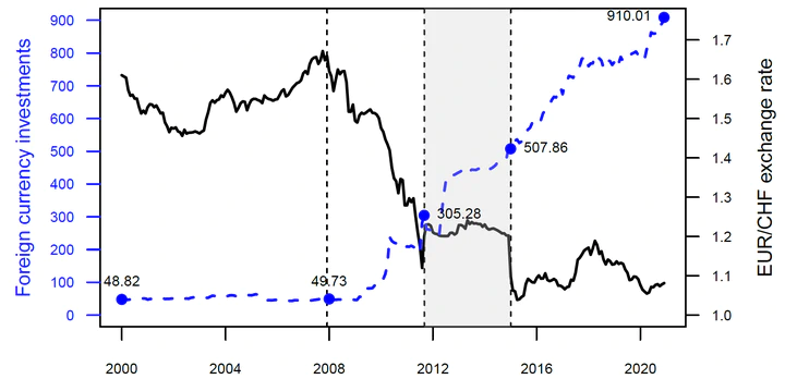 Development of the SNB’s foreign currency investments (FCI) in billion CHF (left vertical axis, blue dashed line) and the observed EUR/CHF exchange rate (right vertical axis, black solid line)We analyze drivers of the EUR/CHF exchange rate in different regimes between 2000 and 2020. Structural breaks between these subperiods are estimated in an integrated way together with the drivers that are relevant during these subperiods. Overall, the main drivers of the exchange rate include European equity and volatility indices, interest rate and term structure slope differentials, as well as monetary policy interventions. For the ‘peg period’ Sept. 2011–Jan. 2015, in addition to the observed exchange rate we also analyze the drivers of the latent exchange rate that could have been observed in the absence of the peg. Interestingly, the SNB’s foreign currency investments became a significant driver of the EUR/CHF exchange rate only after the end of the peg period when there was no longer an officially communicated target rate.